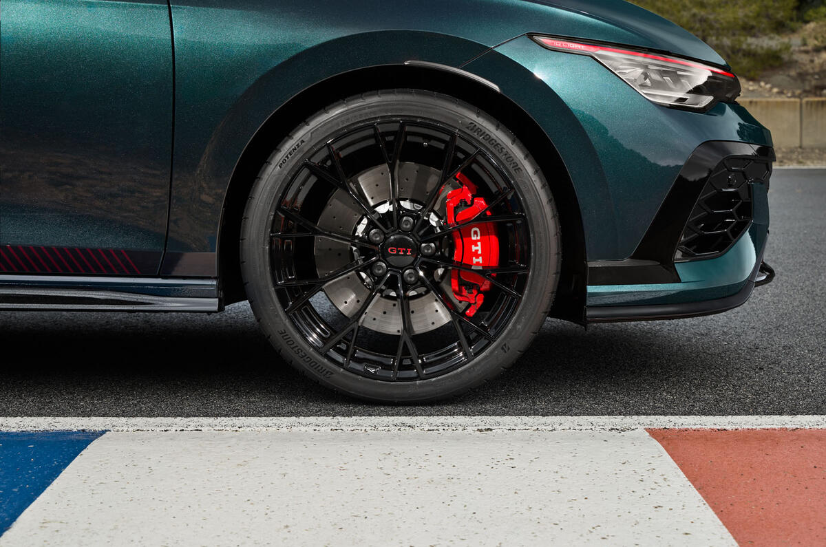 Opting for the Performance Package changes things more than the styling suggests. The fine exterior details are completed by a set of forged wheels and Bridgestone Potenza Race semi-slick tires, which reduce unsprung mass by 4.5 kg per corner. Also, the ride height drops to 20 mm below a standard Golf, sitting 5mm lower than the Clubsport. Visually subtle, mechanically meaningful.