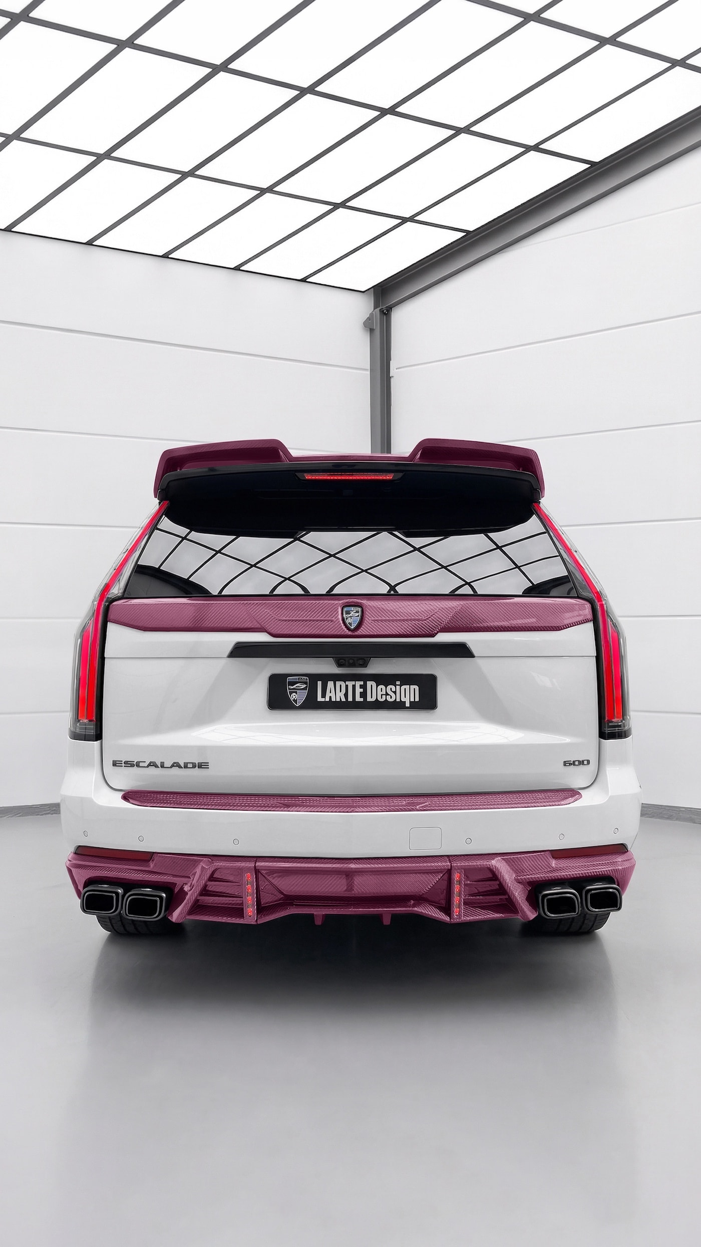 The base vehicle left GM’s Arlington Assembly plant in Texas in Vibrant White Tricoat. From there, the project changed course. Larte Design, working out of Irvine, California, gave the full-size SUV a pink and white finish centered on a one-off pink carbon treatment. The company says the color effect does not come from paint. Pink pre-preg carbon was integrated straight into the material itself, which is the core of the whole build.