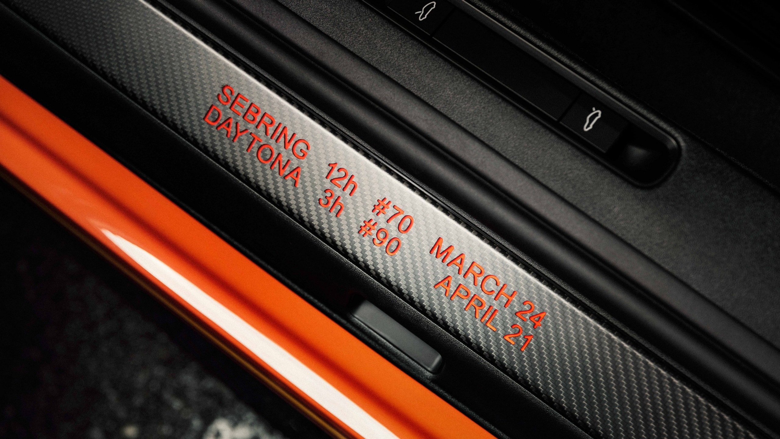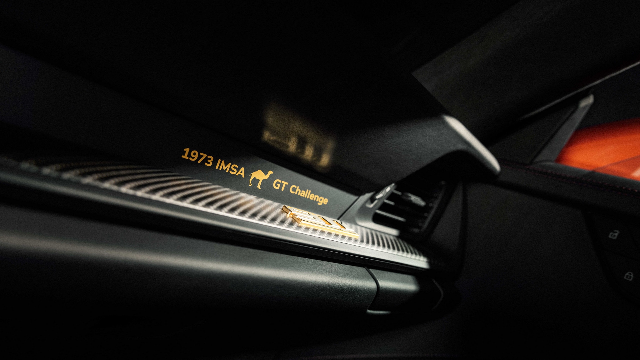 More than that, when you open the doors, there is the logo projector throwing an image onto the ground, revealing the camel behind the wheel of a racing sports car. Around those details are outlines of Sebring, Daytona, Indianapolis, and Lime Rock Park, the circuits tied to the original machine’s competition life.